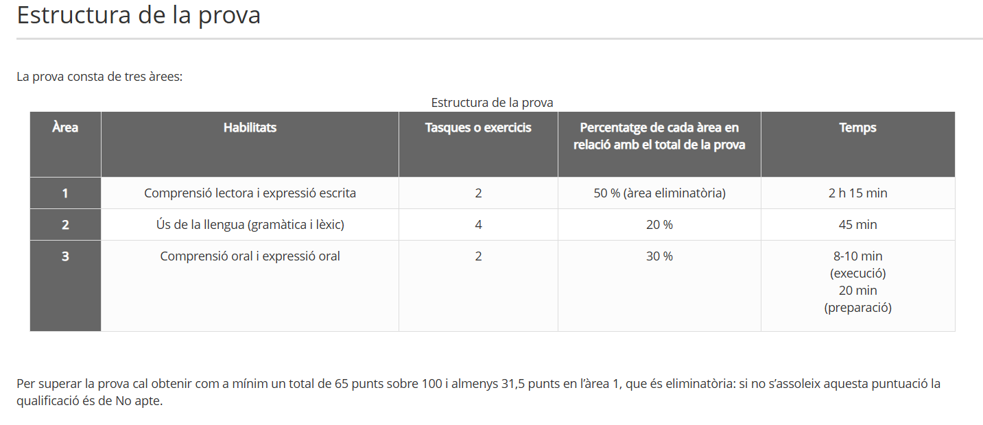 La prova de l’Institut Ramon Llull consta de quatre àrees: Expressió escrita, Comprensió lectora, Gramàtica i vocabulari i Expressió oral. Les àrees d’expressió escrita (la de major percentatge) i d’expressió oral són eliminatòries i s’han de superar amb almenys la meitat dels percentatges assignats. En la resta d’àrees no cal arribar a un mínim de puntuació; tanmateix, la mitjana de la puntuació total ha d’arribar a un mínim del 70%. Les errades de la comprensió lectora i de la gramàtica i vocabulari no descompten.